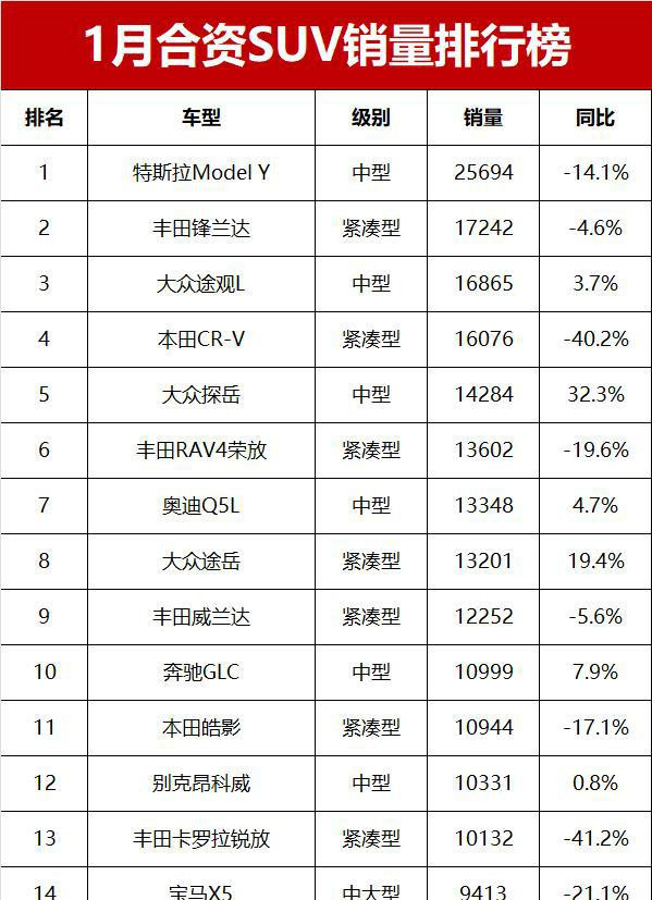 再来看看具体车型。 曾经的销量冠军本田CR-V,1月份销量同比暴跌40.2%! 大众途观L虽然实现了3.7%的同比增长,但与其他自主品牌新能源SUV的增长速度相比,简直是小巫见大巫。 特斯拉Model Y,作为唯一挤进销量榜前列的合资品牌车型,也出现了14.1%的同比下降。